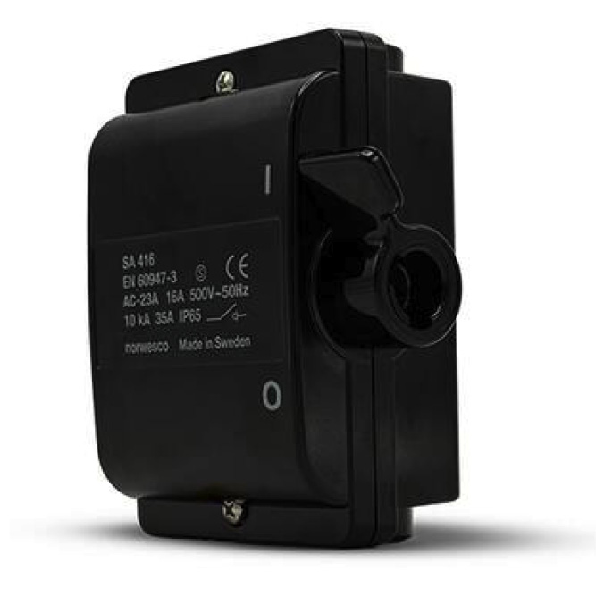 Norwesco werkschakelaar zwart, 4-polig 16A IP65 van het Zweedse merk Norwesco. Door een werkschakelaar te gebruiken voorkomt u gevaarlijke omstandigheden tijdens onderhoud van apparatuur.