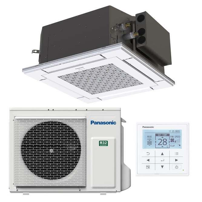 De cassettemodel airco wordt geleverd met een bedrade wandbediening (CZ-RTC5B) voor eenvoudige en nauwkeurige regeling. Daarnaast is de unit compatibel met de Panasonic Comfort Cloud App via de optionele WiFi-module CZ-CAPWFC2, waarmee bediening en monitoring op afstand mogelijk zijn (afhankelijk van configuratie).