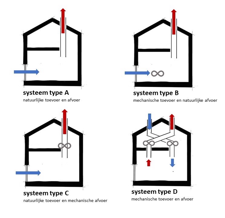 Een mechanische ventilatie systeem type C werkt met natuurlijke toevoer van verse lucht via ventilatieroosters, vaak in ramen of gevels, terwijl de afvoer mechanisch plaatsvindt. Dit betekent dat de verse buitenlucht via roosters naar binnen stroomt en de vervuilde lucht door een ventilatiebox wordt afgevoerd. Dit type ventilatie is energiezuinig en zorgt voor een gecontroleerde en efficiënte afvoer van vocht en geuren uit ruimtes zoals de badkamer, keuken en het toilet.